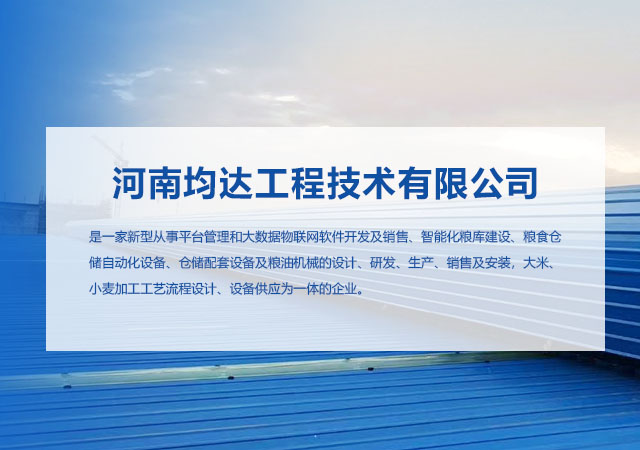 河南均达工程技术有限公司是一家新型从事平台管理和大数据物联网软件开发及销售、智能化粮库建设、粮食仓储自动化设备、仓储配套设备及粮油机械的设计、研发、生产、销售及安装,大米、小麦加工工艺流程设计、设备供应为一体的企业。2021年度获得国家高新技术企业认证和国家级科技型企业认证、郑州市城乡建设局颁发的建筑资质和河南省住建厅颁发安全生产许可证、具有3体系(“ISO9001质量管理体系”、“ISO14001环境管理体系”、“OHSAS18001职业健康安全管理体系”)认证、知识产权管理认证、软件企业和软件产品认证、粮仓空调、粮食谷物冷却机、氮气气调系统、智能化仓储平台软件产品获得中粮设计院国家认证中心的国家级检测认证,拥有专利7项(已授权)、软件著作权21项。 公司消化和吸收了国内外行业内最新技术成果,相继开发出基于物联网的信息化粮库系统、粮情测控系统、智能通风系统、环流熏蒸系统、氮气气调系统、内环流控温系统、在线气体检测系统、多参数粮情系统、自动分拣系统以及粮库专用地上笼、仓房用门窗、挡粮门、视频监控系统、粮仓专用空调设备、低温仓设计施工等相关配套、浅圆仓全套机电设备专业安装(入粮装置、通风、熏蒸)施工、食品加工行业涉及产品的综合性技术、施工方案。同时在粮仓专用空调设备和低温仓建设施工方面有着超前的设计理念、过硬的技术、优质的研发团队、超前多元的施工整体方案解决等,纯自主研发。 智能技术再提升公司立足于高新技术研发平台,致力于中国粮食仓储行业的整体解决方案,涉及粮食仓储行业和食品加工行业两大板块,几十种产品。粮库综合智能提升方面的智慧粮库,是指“可自由高效的利用最新发展的各种信息通信设备、具备更自动化的高度综合性管理功能的粮库”。 均达将与万千客户携手,满怀探索先进技术的热情,不断实现着理想、创新着新的梦想!